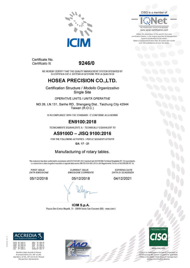和昕精密科技向來以高精度的分度盤領先業界,為追求更加卓越的品質與產品,已於今年十二月通過「AS9100D航太工業品質管理系統」以及「ISO 9001:2015 品質管理系統驗證服務」。證明和昕的研制能力已具備國際級水准。